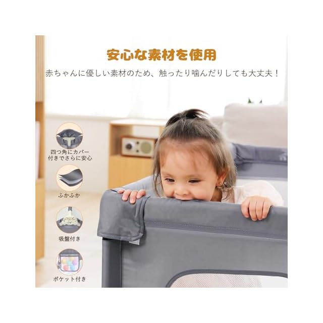 【安全エコ素材・優れた通気性】高品質オックスフォード素材を使用し、耐久性と強度に優れ、柔らかく快適です。BPAを含まず、無毒無臭で、触ったり噛んだりしても大丈夫!側面がメッシュになっており、外から子どもの様子が目につきやすく安心です。また通気性も良く、オールシーズン快適に使えます。