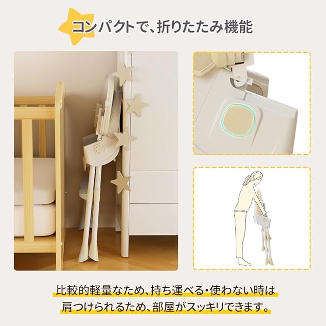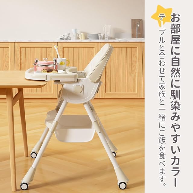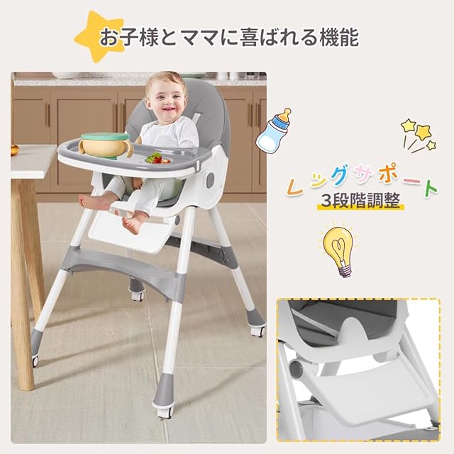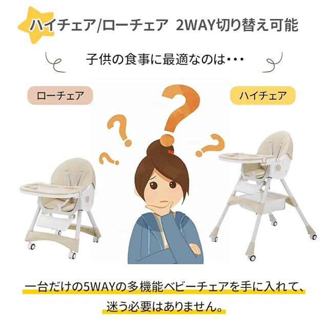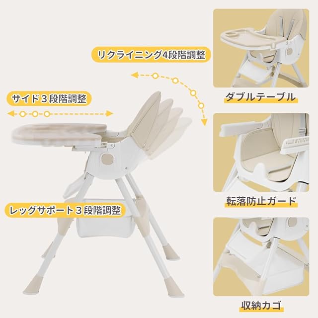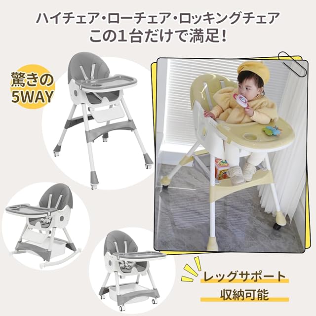 【5点式保護ベルト・収納かご付き】お子さまの落下を防ぐ安全ベルト付きで、離乳食を始めたばかりの月齢の低いお子さまでも安心してお使いいただけます。収納かごが付属していて、オムツ、哺乳瓶やおもちゃんなどをそれぞれ入れ安くて、空間を十分に利用できます。