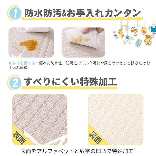 【耐水性・防音性に優れたXPE素材】XPE素材自体が防水性に優れており、液体の侵入を防ぎます。誤ってマットに液体をこぼしてしまった場合でも、ペーパータオルや湿らせた布で軽く拭くときれいに戻りますので、お手入れが簡単で、赤ちゃんにも適しています。 同時に吸音機能もあり、足音や振動を効果的に軽減します。