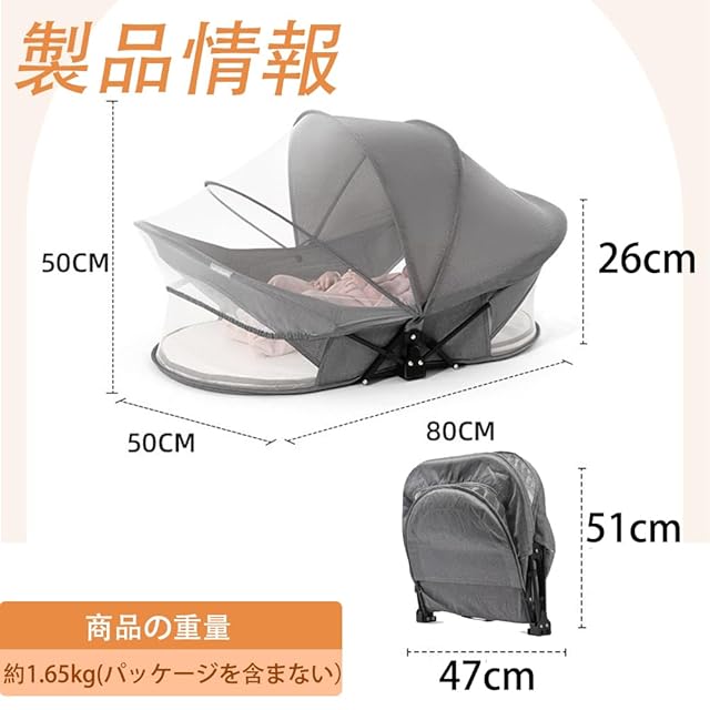 Areden ベビーベッド ベビーラック ベビーバスケット 持ち運べるベビーベッド サイズ:80x50x50cm 折りたたみ 蚊帳付き 軽量 通気性と視認性に 乳児用 ベビーラック 簡易ベッド 組み立て簡単 赤ちゃん 寝具 出産祝い ベビーベッド用マットレス1枚、収納袋1枚付き(グレー)