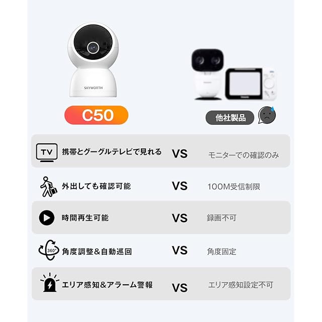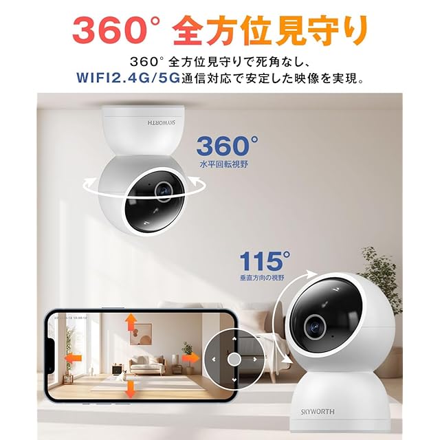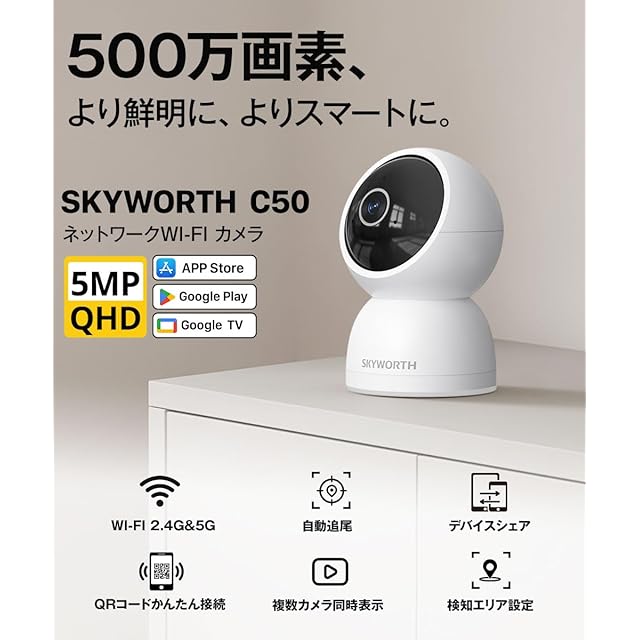 【SKYWORTH見守りカメラ】ついに2.4と5GHzに対応した最新モデル・ 500万画素の高画質・QRコード簡単設置・AI動体検知・自動追跡機能・検知エリア設定・360°自動定期見回り・夜間の暗視撮影・Google TV対応・プライバシー機能・スマホ通知・双方向通話・24時間録画・家族共有機能・最大512GBのSD/クラウド保存対応・接続台数無制限・安全認証取得・日本語カスタマーサポート&製品保証付き