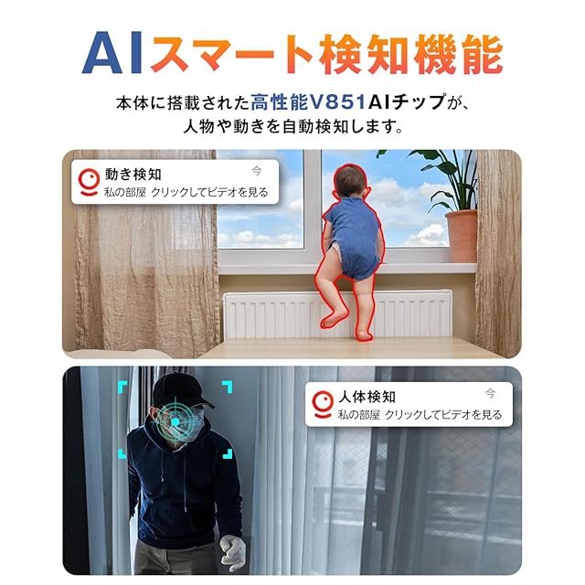 【AI動体検知・スマホ通知・自動追跡】 上下左右に対応したAI自動追尾機能で、動く人物やペットをしっかり追跡。人体検知・モーション検知に対応し、不審な動きを感知すると、スマホ通知と警報通知を即時に送信します。防犯カメラとしての高い性能に加え、複数の特定エリアを自由に設定できるため、重点エリアを集中して監視する見守りカメラとしても活躍します。