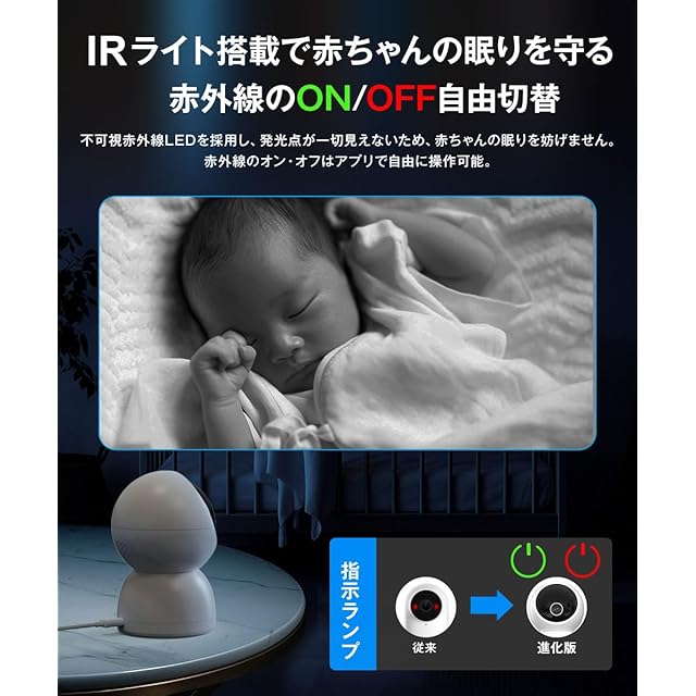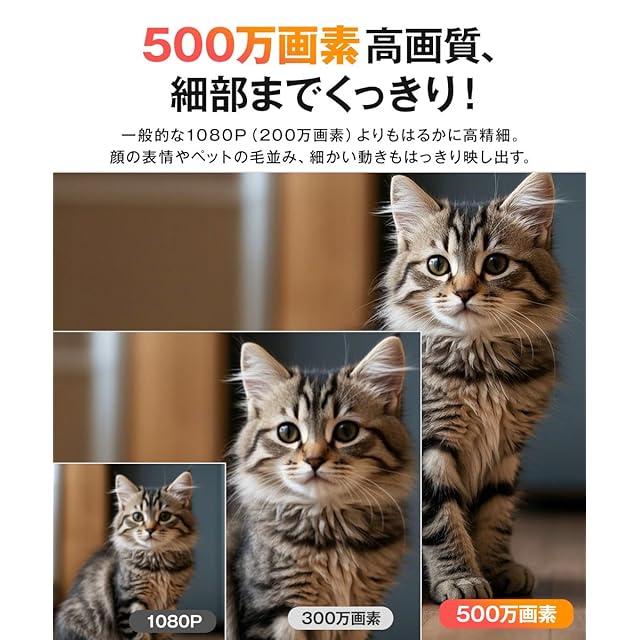 【500万画素の超高画質・3K QHD+赤外線暗視対応】 1080pを超える3Kクラスの500万画素(2880×1620P)&F1.6大口径レンズ搭載。暗所でもしっかり映る940nm赤外線LEDとHDR補正により、逆光や夜間でも鮮明な映像を提供します。 ペットカメラ や ベビーカメラ 、 みまもりカメラ として、犬・猫・赤ちゃんの様子をくっきり記録。