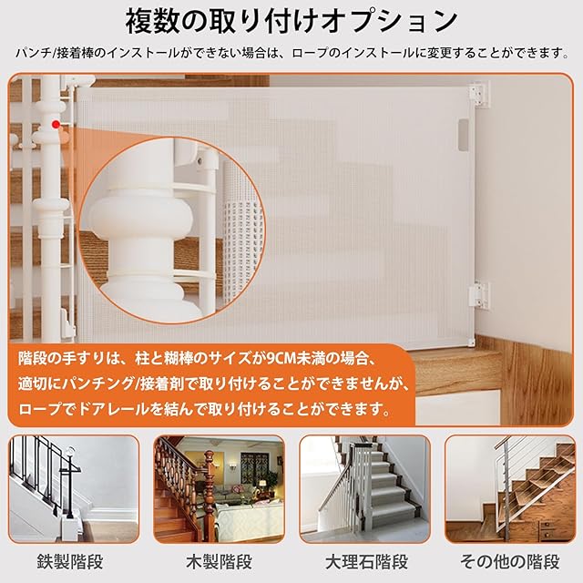 【二つの取付方法】ベビーガードは釘を打って壁に取り付けるか、穴を開けずにテープで壁に貼り付けることができます。ニーズに合わせて取り付けることができます。ガードレールはドア枠の内側にも外側にも設置できます。取り付けはとても自由で、制約がありません。