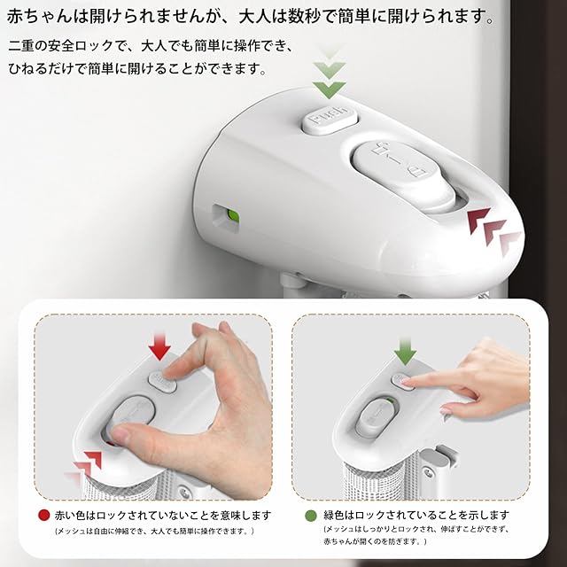 【安全ロック設計】安全ロック機能、操作が簡単で、片手で操作してドアの柵を開けることができます。ボタンを押してロックアイコンに向かって回転して、メッシュドアバーはロック状態となり伸縮できません。アンロックのアイコンを向かって回転して、アンロック状態になって、メッシュドアバーが正常に伸張することができます。ドアバーがフックに掛けられているとき、安全ロックをロック状態にねじると、メッシュ布を移動することができません。乳幼児が不注意な触れるのを防ぐことができます。