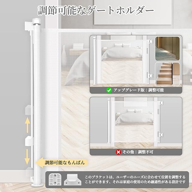 使用場所が広い:階段、バルユニー、バスルーム、出入り口、玄関、キッチンなどに設置可能です。赤ちゃん、ペットが入りそうな場所に設置できます。部品で乾式壁、木、硬い壁などの硬い表面の間に設置する必要があります。
