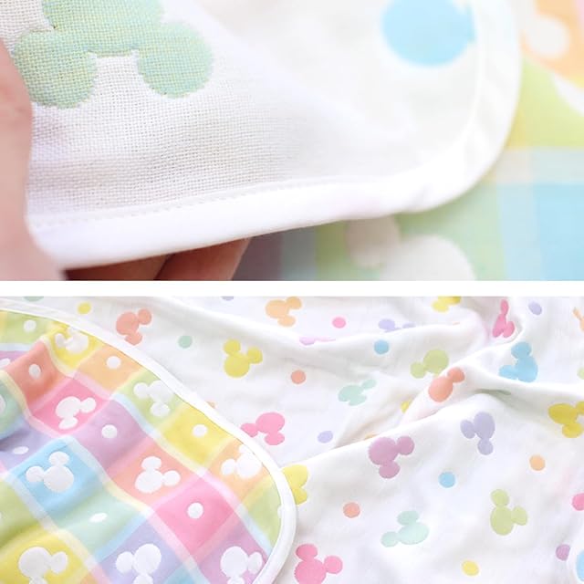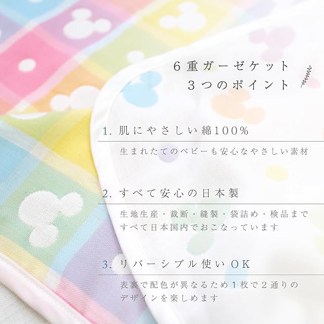 【こだわりのディズニーデザイン】リバーシブルOK!1枚で2通りの柄が楽しめる当店オリジナルデザインの6重ガーゼケットです♪生地生産・裁断・縫製・袋詰め・検品まで全ての工程ALL日本製!undoudouのこだわりの多重ガーゼシリーズです。白地にカラフルな〈ミッキー〉アイコンが映えるおしゃれなデザイン≪ディズニーベビー≫ (C)Disney