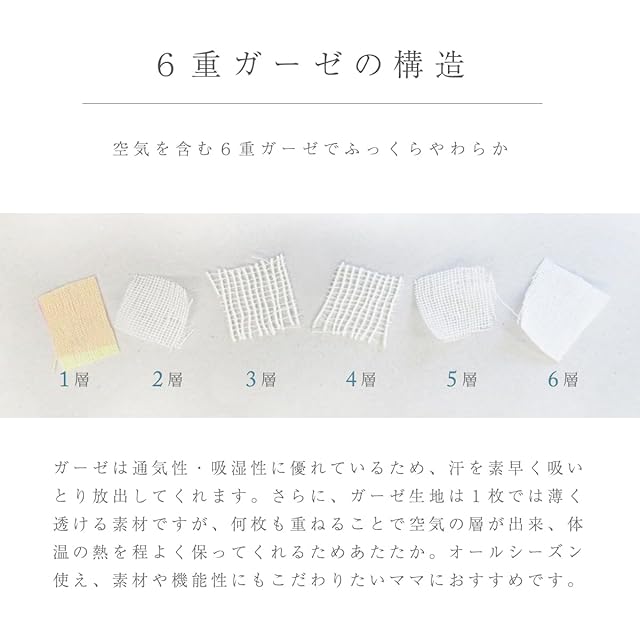 【洗濯も可能】やわらかガーゼを6枚重ねた生地は、空気を含み、洗うたびふわふわ心地良さが増すため、愛着がわき手放せなくなります♪洗濯後の乾きが早く、忙しいママには嬉しいポイントです。