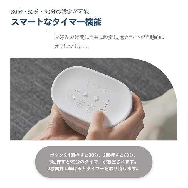 【タイマー・メモリ機能】 スマートなタイマー機能、30分・60分・90分の中から設定し、音とライトが自動的にオフになる。設定を記憶するメモリ機能。電源を切っても前回と同じ設定で使用が可能