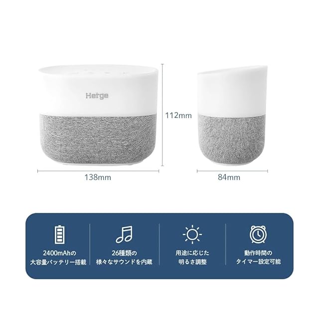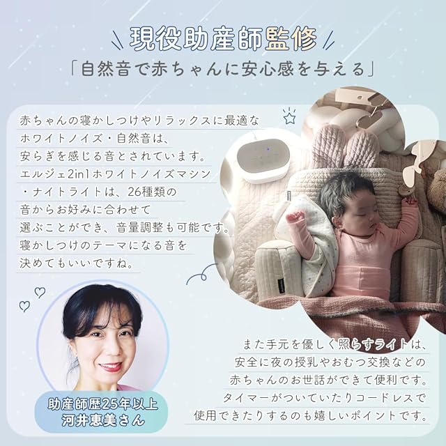 【ホワイトノイズマシンとナイトライトの一体型】 夜間授乳やおむつ替え時の明るさ調節→ナイトライト。寝かしつけ、夜泣き対策→ホワイトノイズマシン。両方使えるアイテム。快適な寝室づくりを手助けします。