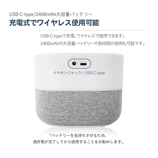 【大容量バッテリー】 充電式でワイヤレス使用可能。2400mAhの大容量バッテリーで長時間の使用も可能