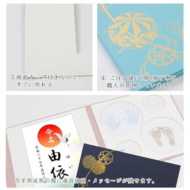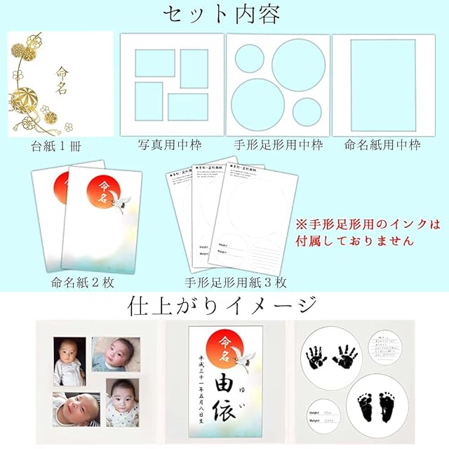 中枠3枚(命名書用/L判写真4枚用/手形・足形用)・命名紙2枚・手形・足形用紙3枚付き 日本製