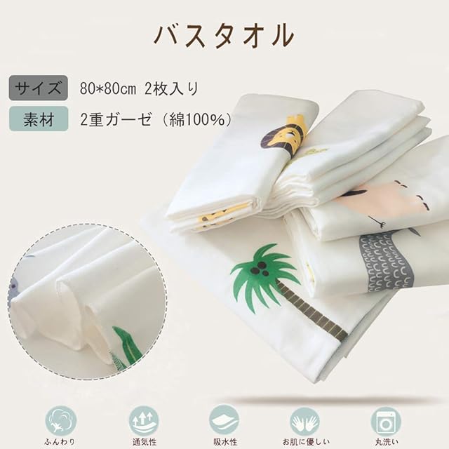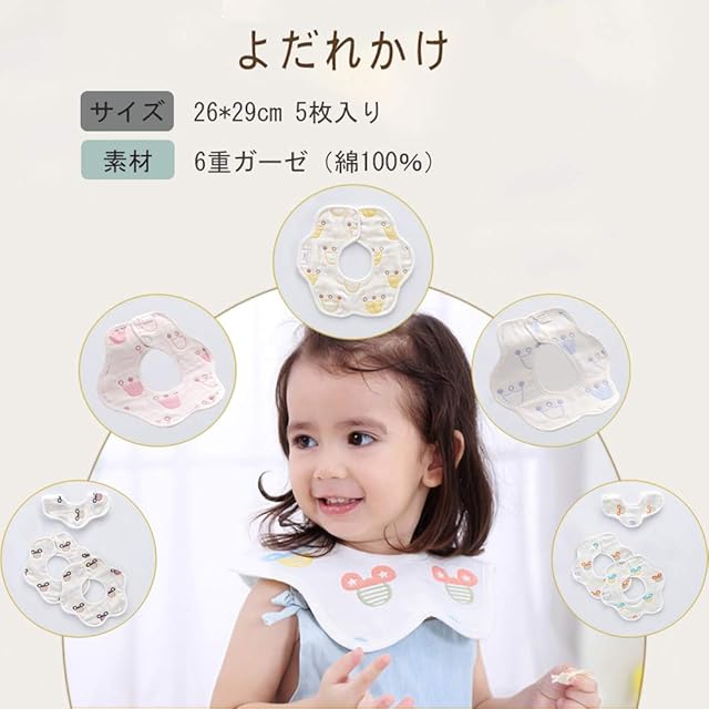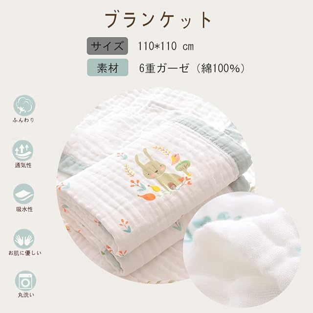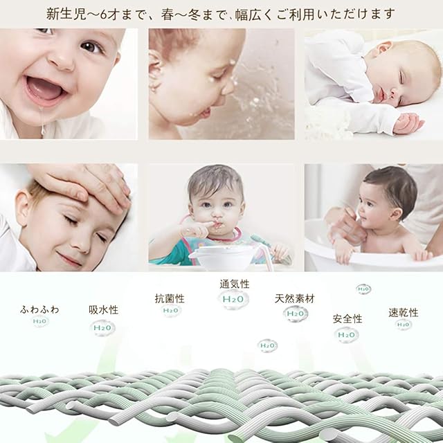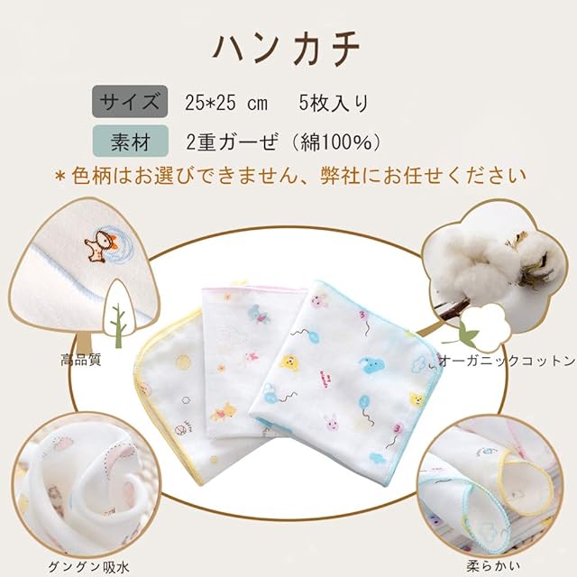 セット内容:ガーゼケット(1枚):6重ガーゼ、110*110cm。バスタオル(2枚):2重ガーゼ、75*75cm。ハンカチ(3枚):オーガニックコットン100%、22*22cm。よだれかけ 3才まで使用(5枚):6重ガーゼ、26*29cm。