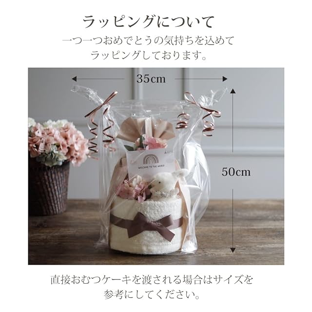 衛生的おむつ個包装:当店ではすべての紙おむつを1枚ずつ袋に入れ個包装しておむつケーキを作成しております。