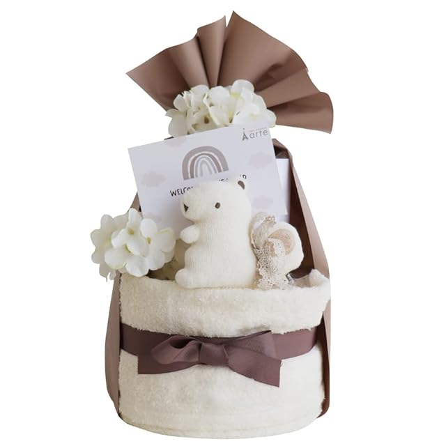 おむつケーキ 出産祝い オーガニック 日本製 男の子 女の子 ベビーギフト 100日 誕生日 春夏秋冬 ナチュラル おしゃれ フラワー 1歳 ハーフバースデー[ベビーアニマル オーガニック おむつケーキ](ココアベージュ)