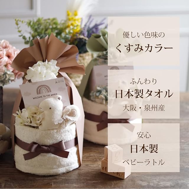 おしゃれなママが大好き、くすみカラーのおむつケーキが新登場。おもちゃ・おむつはオーガニック製。お肌に優しい赤ちゃんに嬉しい出産ギフトです。