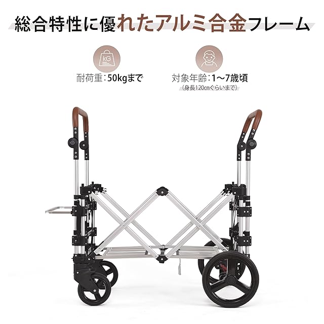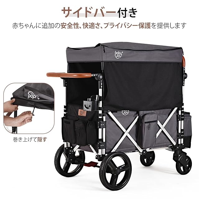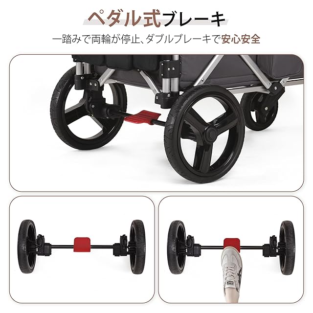 【多機能】 収納バッグ、カップホルダー、吊り下げバッグ、スマホホルダーが付いており、母子用品を運んだり、赤ちゃんがハイハイで簡単に乗り降りできます。また、ワンステップフットブレーキシステムを採用しているので、必要なときに簡単にワゴンを止めることができます。