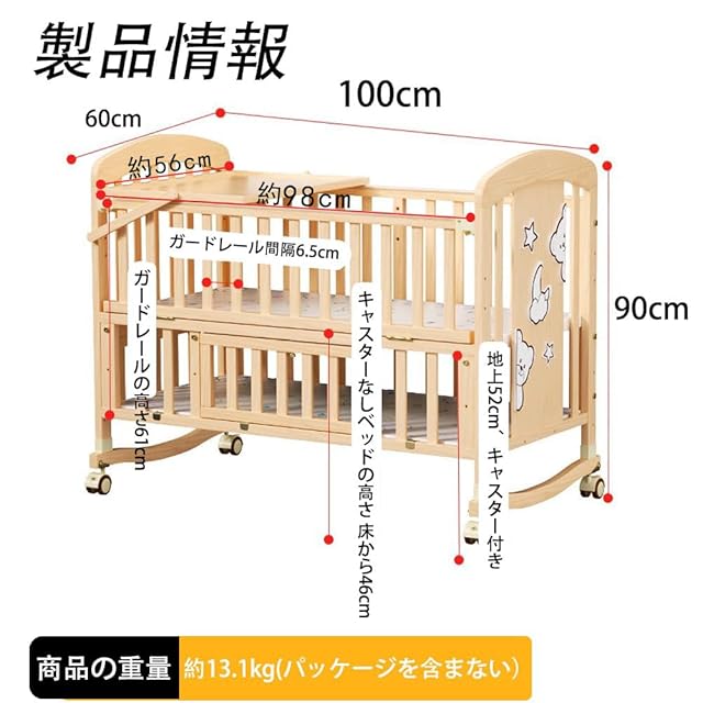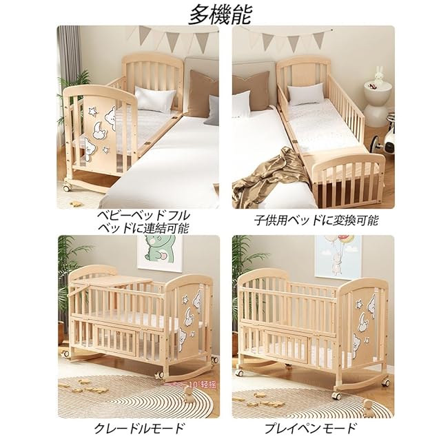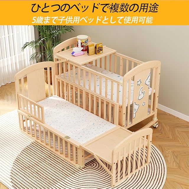【底部収納デザイン】二重構造になっており、一番下の層には赤ちゃんの日用品を収納でき、必要な時に直接取り出せるので便利で実用的。このベビーベッドは、安全で高品質な木材で作られており、安全に使用できるよう、絶妙なサンディングが施され、バリもありません。