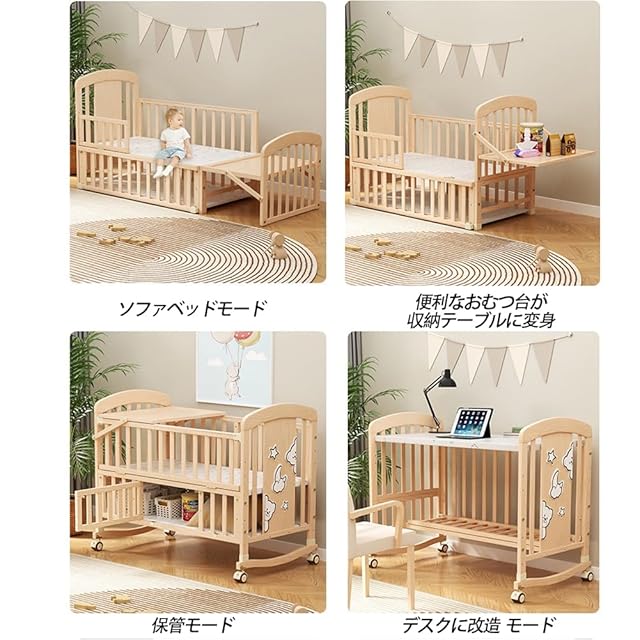 【3段階の高さ調節が可能で】このベビーベッドは、月齢に合わせて3段階の高さ調節が可能で、赤ちゃんの成長に合わせた使い方ができます。赤ちゃんが大きくなっても使わないという心配はありません、デスクとして使えるように切り替えられ、一度取り付ければ、底は収納棚としても使える。