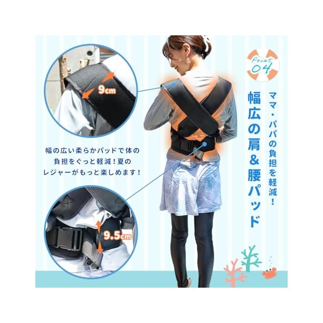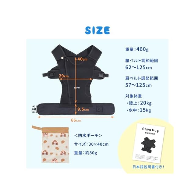 【サイズ】本体:40×29cm 重量:460g、防水ポーチ:30×40cm 重量:約80g【仕様】対象年齢:首座り後~3歳前後、対象体重:20kg(※水中使用時は15kg以下)、ウエスト調整:62~125cm、肩紐調整:57~125cm、洗濯方法は手洗いのみ(防水ポーチは洗濯可能)【素材】本体:ネオプレン、防水ポーチ:ポリエステル