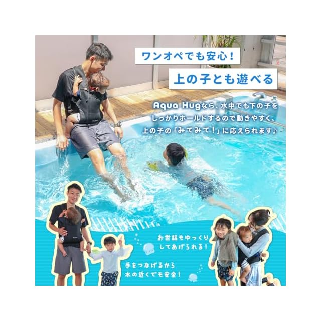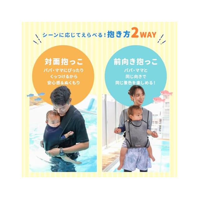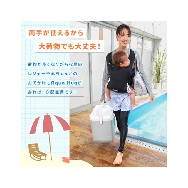 【水陸両用!夏にぴったりの新発想抱っこ紐】 海やプールでも使える「Aqua Hug」は、伸縮性に優れたネオプレン素材でつくられた水陸両用の抱っこ紐。濡れてもOKだから、水遊びも赤ちゃんと一緒に楽しめます。