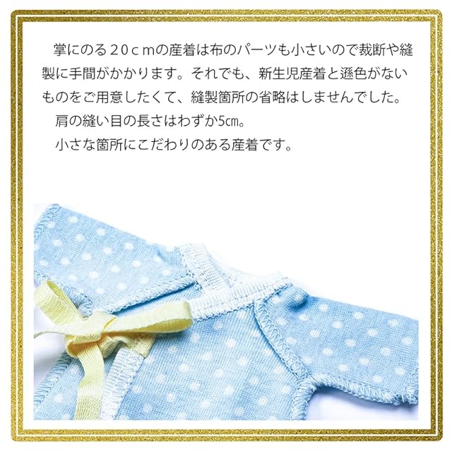赤ちゃんに産着を作ってあげたいけれど、手続きや準備に追われて思うように動けないと、もどかしく感じていらっしゃるかもしれません。ママの代わりに柔らかな水色のニット生地(日本製)を使用して12㎝の小さな産着をご用意しました。赤ちゃんの尊厳を守る産着は、日本の老舗縫製工場の確かな技術で作られています。お手元に届いたら、手のひらにのせて産着の可愛さを感じてみてください。