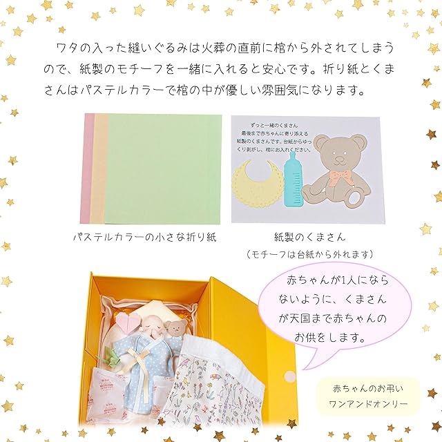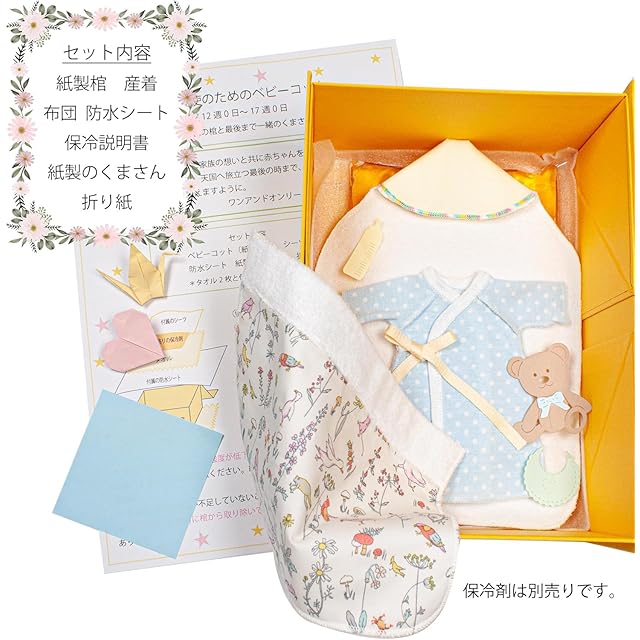 セット内容:紙製棺(組立済み)、産着、布団 、紙製のくまさん、折り紙3枚、防水シート、使用説明書 (お届けの商品は1枚目の画像にある物が全てです。)