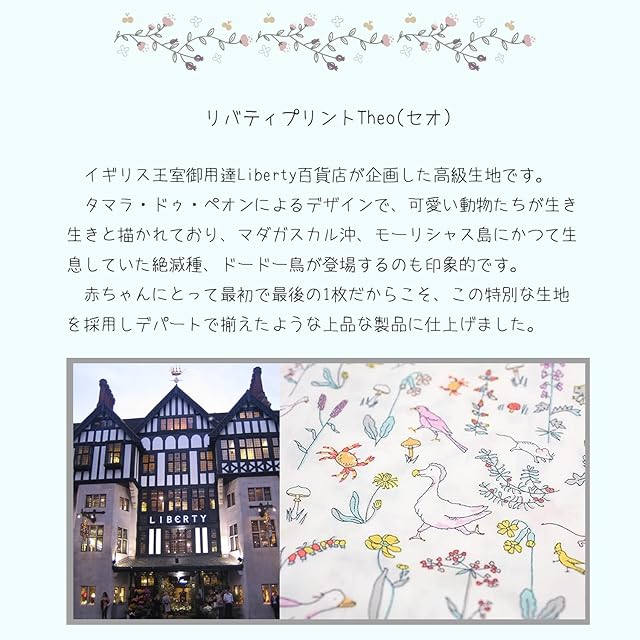 リバティプリント(掛布団生地)とは、ロンドンにある老舗Liberty百貨店が企画した生地のことです。創立当初から現在まで数多くの柄がデザインされており、Theoもその1つです。 可愛い動物たちを生き生きと描いたデザイナーはタマラ・ドゥ・ペオン。マダガスカル沖、モーリシャス島にかつて生息していた絶滅種、ドードー鳥が登場するのも印象的です。 そして、織の名前はピカデリーポプリン。紳士用シャツなどに使用される高密度で張りがある綿100%の美しい生地です。 赤ちゃんの最初で最後の1枚だからこそ、この特別な生地を採用しデパートで揃えたような上品な製品に仕上げました。 実は、多くのアパレルブランドでTheoを使った小物が作られています。将来、赤ちゃんと繋がりが欲しくなった時にTheoの名前を思い出してはいかがでしょうか。