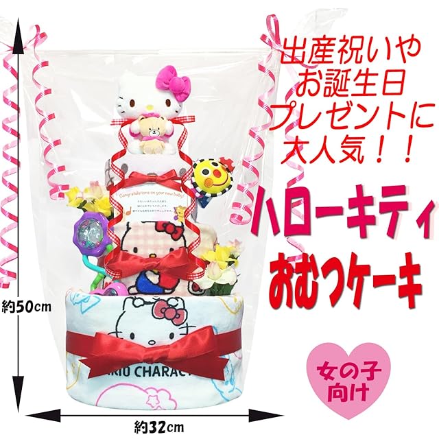 愛らしいキティちゃんデザイン: サンリオの人気キャラクター、キティちゃんがデザインされたおむつケーキは、見るだけで心が温まるかわいらしさ。赤ちゃんの誕生を祝う最高の贈り物です。
