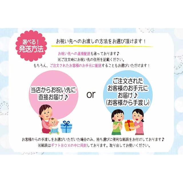 【心を込めた贈り物を】おむつケーキ専用のギフトボックスに包装し、直接お祝い先へお届けいたします。ご注文者様とお届け先名が同じ場合は、ギフトボックスからおむつケーキを取り出し、手渡し用の紙袋に入れてお持ちください。