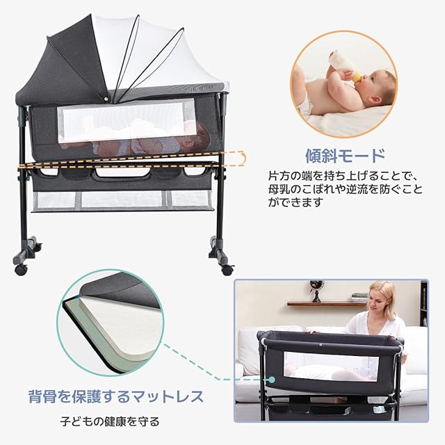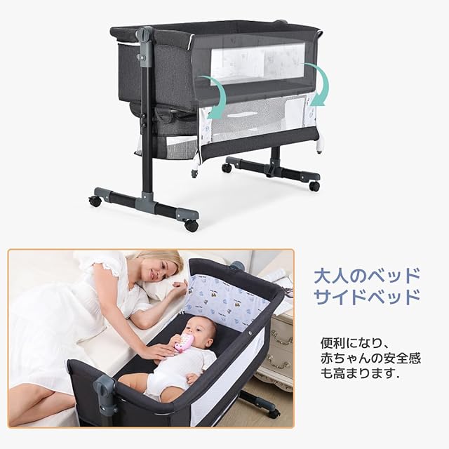 「調整可能」ベッドの高さが上へあるいは下への調整可能ベビーベッドなので、様々のベッドもピッタリします。ベビーベッドは片方が高く、片方が低くなれば、傾斜角があり、吐き戻しも防止できるベビーベッドになります。また、ベビーベッドのサイドも昇降可能でとても便利です。