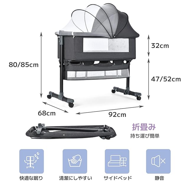 「持ち運び」4つの静音キャスター付きなので360°自由に回転し、床を傷つくことなく楽に移動できるベビーベッドです。ママも簡単に持ち運びが可能です。「収納カゴ」ベッドの下に、収納カゴがあるから、荷物やおもちゃんまたはおむつなどをそれぞれ入れやすい、空間を十分に利用できるベビーベッド。