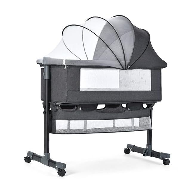 Bornran ベビーベッド 折畳み バウンサー 新生児 ミニ 添い寝 baby bed 高さ調整 蚊帳 出産祝い 通気性 キャスター付き 92*68*80cm (グレー)