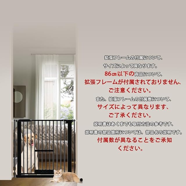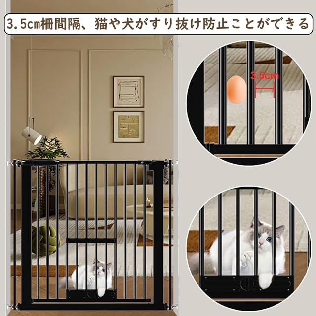 【3.5cm柵間隔&過密フレーム付き】柵の間隔は3.5cmで、小さなペットや子猫がすり抜け防止ことができる。そして最大限のサイズをご利用する場合は、安全性を高めるために両側からすり抜け防止の過密フレームを取り付けします。2つの過密フレームを使用すると、ドアの隙間を狭めることができます。猫用ゲートに最適の選択です。