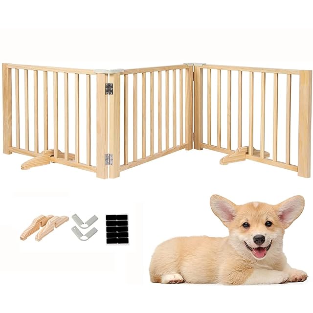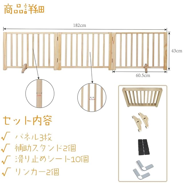 木製 ペットゲート パーテーション 置くだけ ペットフェンス 犬 柵 安全柵 小型犬 中型犬 脱走防止 ガード 飛び出し防止 多頭飼い ペットガード (幅182cm x高さ43cmx奥行き60.5cm(3枚))