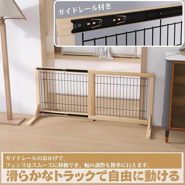【スムーズな操作感】スムーズな動きを実現するガイドレール付きのペットゲートです。ガイドレールのおかげで、フェンスはスムーズに移動でき、幅の調整も簡単に行えます。引っ掛かりや動かしにくい状況を解消しました。