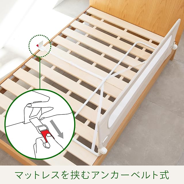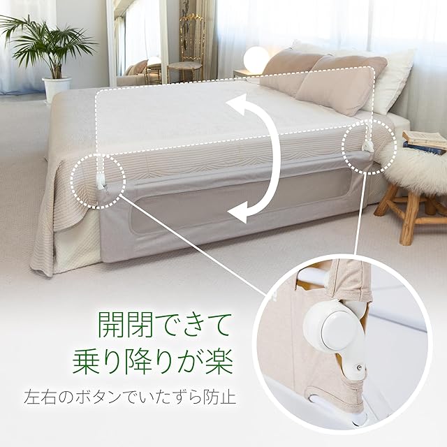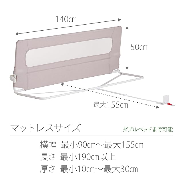 ■【マットレスサイズ】最小幅90cm,最大幅155cm,長さは190㎝以上、厚みは最小10㎝、最大30㎝のマットレスで使用できます。一般的なダブルベッドの幅は140cm~150㎝で使用いただけるようになっております。ベッドの左右両方の側に設置できます。(頭側、脚側には設置できません)