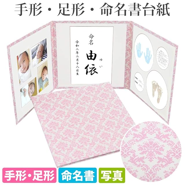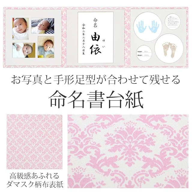 命名書 台紙 手形 足形 赤ちゃん 手形 足形 写真 お名前がすべて入る【ダマスク(ピンク) L判セット】 人気 可愛い かわいい 手作り 飾る 内祝い シンプル 赤ちゃん命名書台紙 出産祝い 記念品 命名紙 名づけ 命名 祖父母 プレゼント 自分で書く オーダー 子供 名入れ 用紙 お七夜 日本製(ダマスクピンク63)