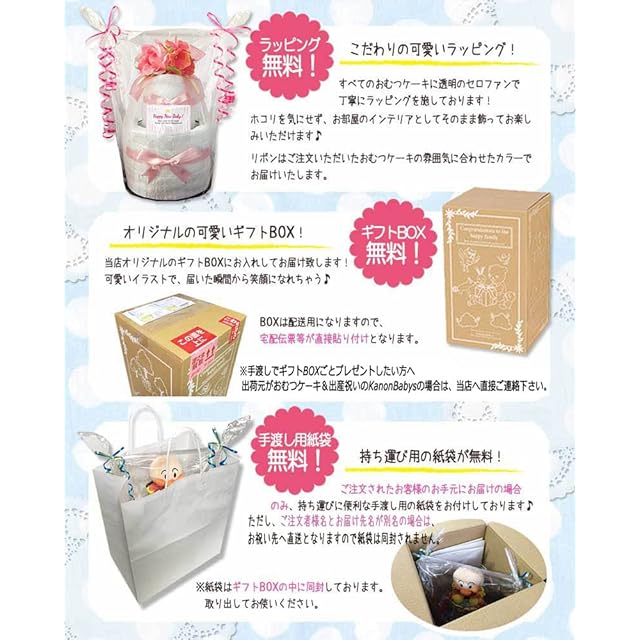 【お祝い先へお届け】出産祝いなどで、お祝い先へお届けに喜ばれるお祝いギフトです。オムツケーキ専用のギフトボックスに包装し、祝い先へお届けしますとサプライズ間違いなし!ご注文者様とお届け先名が同じ場合は、ギフトボックスからオムツケーキを取り出し、手渡し用の紙袋に入れてお持ちいただけます。