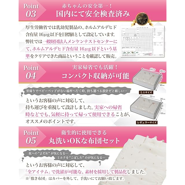 【こだわり】様々なメーカーから ベビー布団や ベビー敷布団 のセットとして” ベビー敷布団 ”が販売されていますが、Rozallyの 敷布団 は”こだわり”が一味違います。赤ちゃん用品をメインに取り扱っている10社以上の工場からサンプルを取り寄せ、「快適な寝心地×コンパクトな持ち運び」を一緒に試行錯誤して頂けた1社に絞って発注を行なっています。