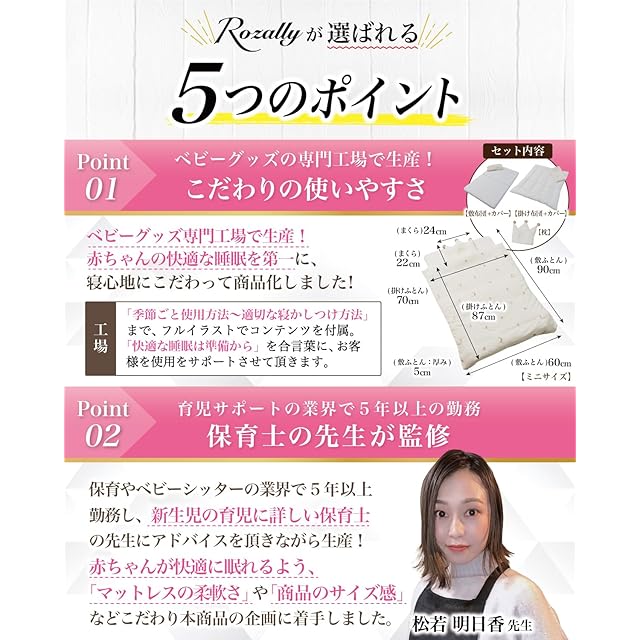 【保育士が監修】 Rozally ベビー布団セット がついに正式販売開始。 「ふかふかな寝心地のベビー布団が欲しい…」というお客様の声から生まれた 「枕」「掛け布団」「敷き布団」「マット」「シーツ」 が1つになったベビー用布団セットです。コンパクトに収納にして 持ち運び 可能な点も人気の1つです。 幼稚園や保育園のお昼寝で必要になる入園アイテムとしても購入頂いております。 企画&設計では 新生児 や 乳幼児 など 子供 の育児に詳しい【保育士】の先生からアドバイスをもらい、衛生的に使えるよう丸洗い可能な素材選定を行いました。 シンプルで可愛いデザインに仕上げたため出産準備や出産祝いなどギフトにも最適になっています。