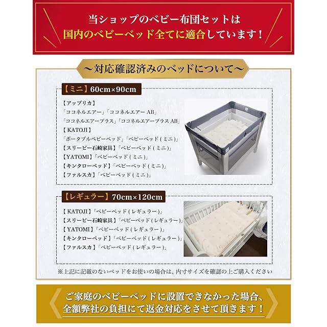 【使用可能なベビーベッド2】 【レギュラーサイズ】_[70cm×120cm] 【KATOJI】「ベビーベッド(レギュラー)」 【スリーピー石崎家具】「ベビーベッド(レギュラー)」 【YATOMI】「ベビーベッド(レギュラー)」 【キンタローベッド】「ベビーベッド(レギュラー)」 【ファルスカ】「ベビーベッド(レギュラー)」