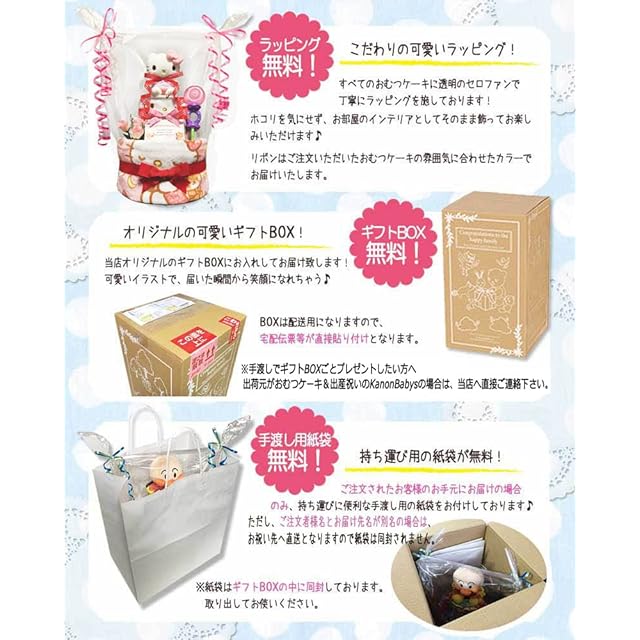 【心を込めた贈り物を】おむつケーキ専用のギフトボックスに包装し、直接お祝い先へお届けいたします。ご注文者様とお届け先名が同じ場合は、ギフトボックスからおむつケーキを取り出し、手渡し用の紙袋に入れてお持ちください。