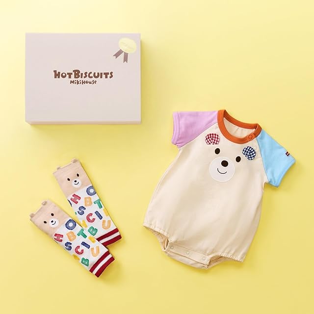 ミキハウス ホットビスケッツのベビーギフトセット。 夏におすすめのボディシャツ(ロンパース)とレッグウォーマーのセットです。 ボディシャツは人気の顔ドンシリーズ! 胸元のくまの顔が子どもらしいデザイン。 夏場はお腹の締め付けもなく、一枚で涼しく快適に過ごしていただけます。