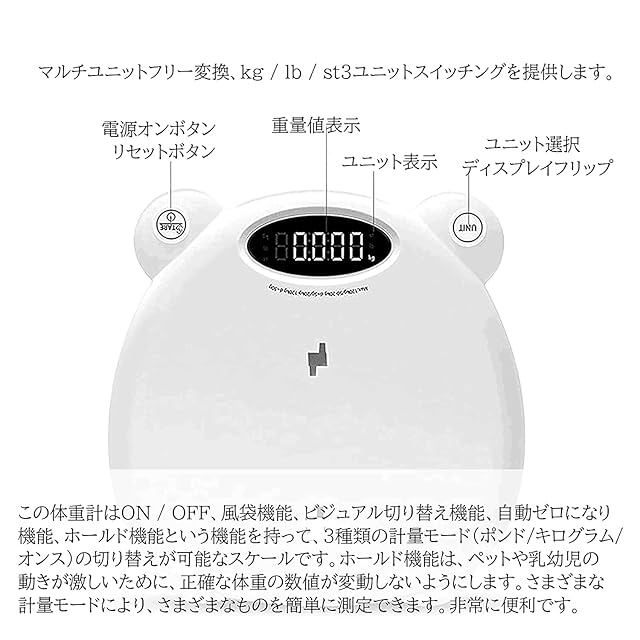 ★最大計量可能重量(ひょう量):120kg、最少表示重量:50g 必要に応じて様々な計算が可能です、kg、lb、st。 ※50g未満の製品は計量できません。※0~20kgまでは5g単位、20kg~は50g単位での計測になります。※計量結果と実際には0-80gの誤差があるかもしれないので、ご了承ください。ご注意:体重測定の前に、「ON / OFF / TARE」キーを押してリセットしてください。