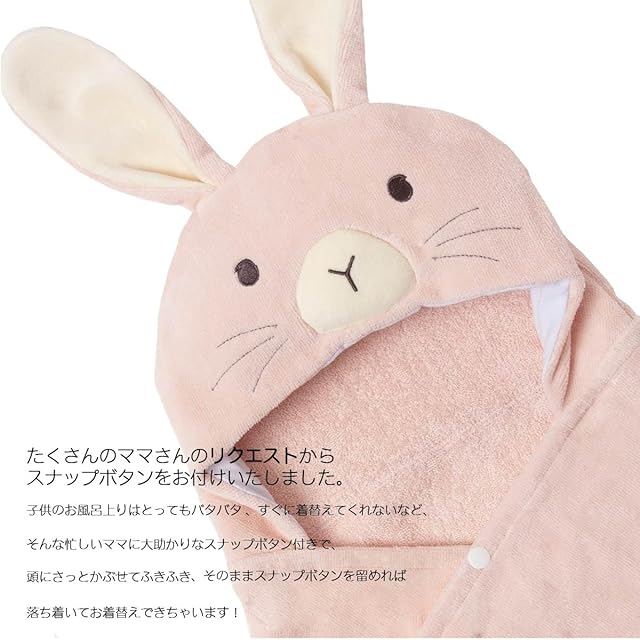 【便利な機能】お母さまの声からベビータオルにスナップボタンを付けました。これで風呂上がりに家の中を走り回ってもはだけないので安心。また頭部にフックがあるのでそのまま引っ掛けられば乾燥にも役立ちます。 【可愛いデザイン】男の子