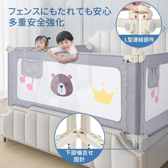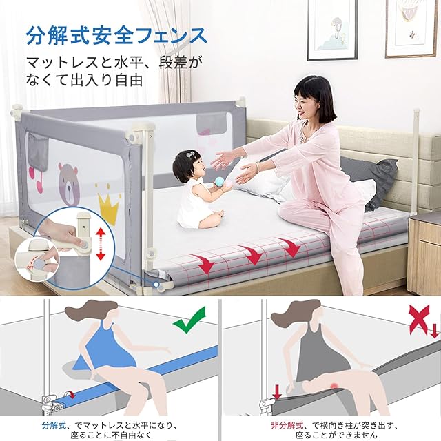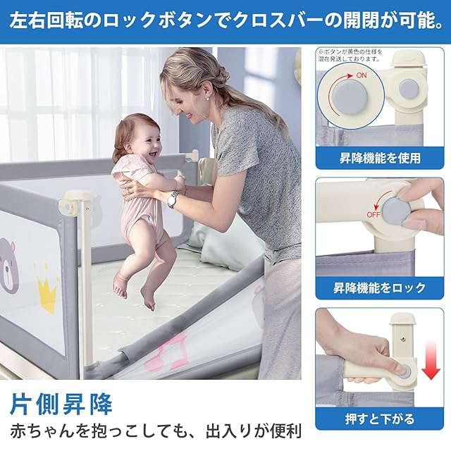 【ツマミ式ダブルロック】いままでのデザインの性能を引き継ぎ、安全性と便利性を兼有のツマミ式ダブルロックを革新。ツマミ式ロックをonに回さないと、ボタンを押してもバーを外せない。お子様の誤解除を防止とともに、使いやすくなります。【座れるベッドフェンス】従来下げたレールが座る支障になるフェンスと比べ、革新な分解式横向き柱が一番下に下げた後、フェンスから外せて、長時間ベッドの側面で座れます。更に、出入りする際に柱をぶつかることがなくなり、より安全に出入りすることができます。※