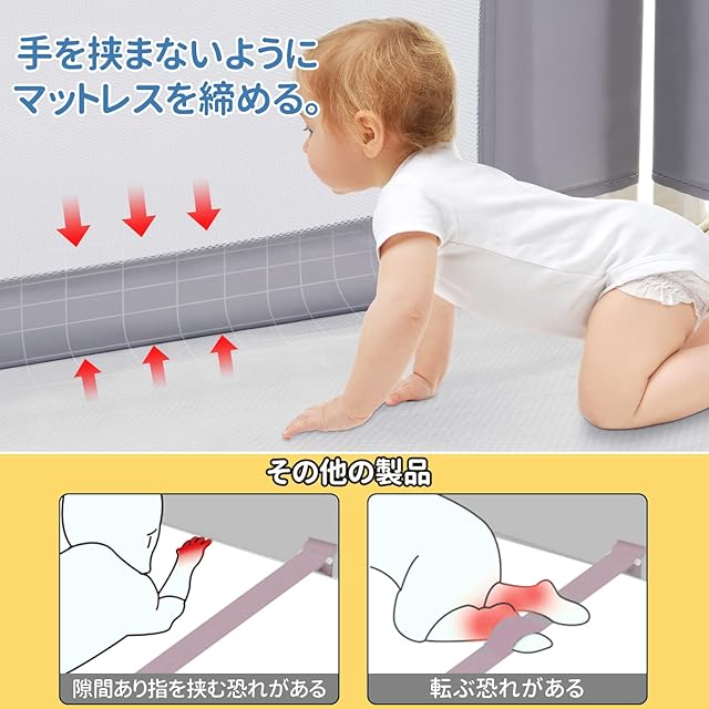 【高品質な素材・安全性】環境に優しい材料で作られており。しっかりしている構造で布団を蹴り出しても、ベッドからの転落を心配いりません、メッシュ網で視線を隠せない、赤ちゃんの動きと様子を随時確認でき、安全性も強化されています。