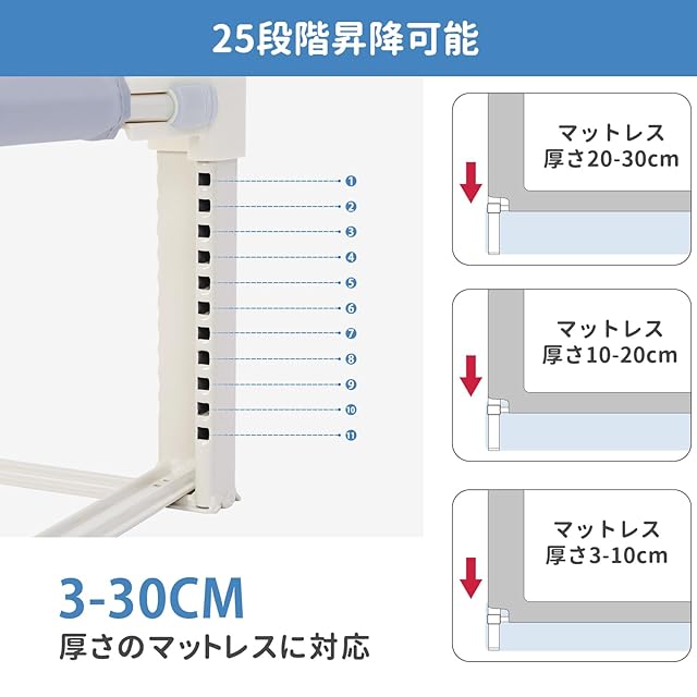 【精密調節可能】ベッドのガードレールは25段階精密に調整可能であるため、3cm~30cmまでのマットレスと市販のベッドに大幅対応できます。