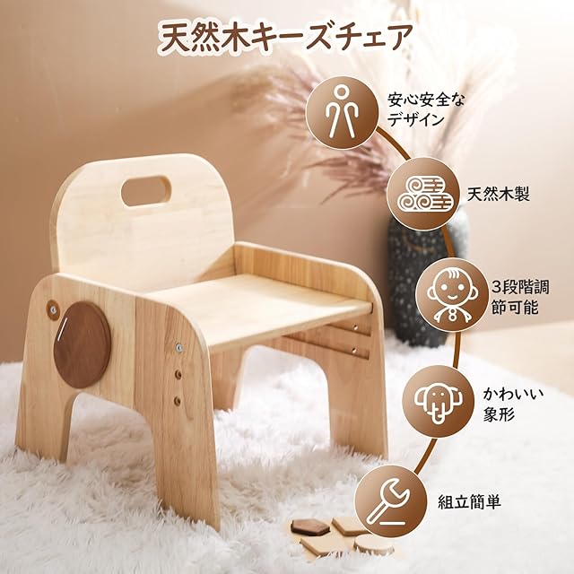 木目の美しい天然木ラバー材を使用した木製キッズローチェア。子供から大人まで、ご使用される環境により3段階に高さを変えることができます。頑丈な作りで安全に長く使用できます。